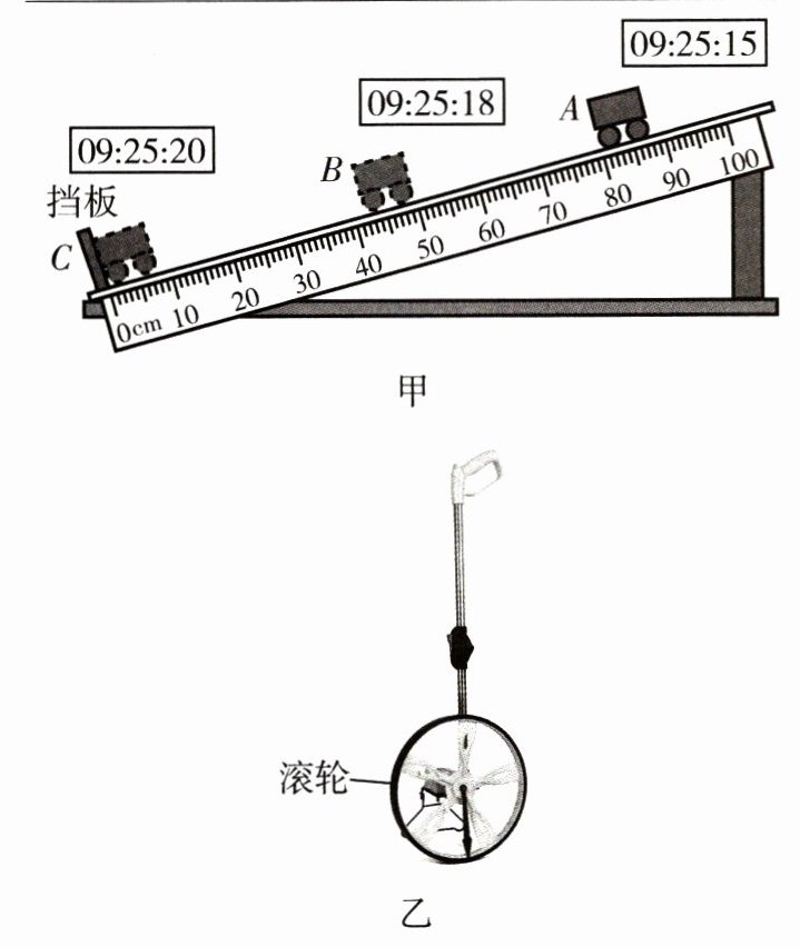 1. 图甲是测量物体运动的平均速度的实验装置。实验时让小车从斜面的 $ A $ 点由静止滑下,分别测量出小车到达 $ B $ 点和 $ C $ 点的路程和时间,利用速度公式计算出小车运动的平均速度。
