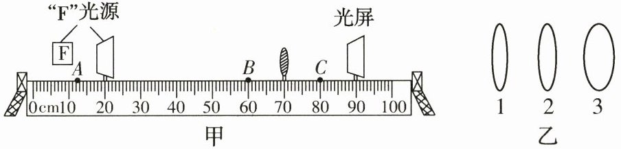 21. 近视程度不同的同学需要戴焦距不同的眼镜。为了探究近视眼的矫正过程,组装如图甲所示的实验装置,其中“F”字样的光源代替可视物体,光屏模拟视网膜。选用如图乙所示的2号凸透镜模拟晶状体,打开“F”光源,调节各个元件的位置,直到光屏上呈现倒立、缩小的清晰像,正常眼睛的视物模型便组装完成。