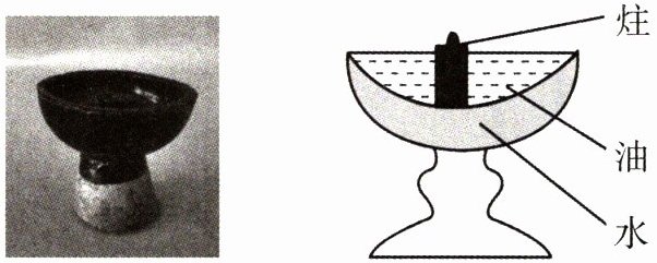 3. 古代蜀地人使用的“夹瓷盏”省油灯如图所示。省油灯的灯体如坦口碗状,为上下夹层,上面一层为盛油的油盏,油盏下腹部中空,在其腰部开出一小孔,从小孔处向夹层中注入冷水。其原理是利用夹层里的水可以______(填“降低”或“提高”)油的温度,使油蒸发______(填“加快”或“减慢”),达到省油的目的。