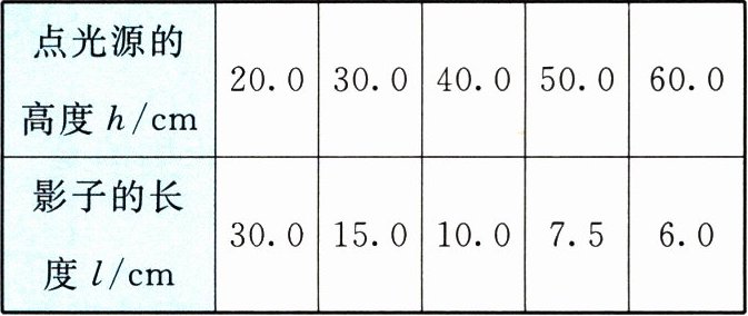 (2)分析上述实验数据还可得出:在点光源逐渐上移的过程中,若点光源高度的增加量相同,则影子长度 $ l $ 的变化量______(填“增大”“减小”或“不变”)。