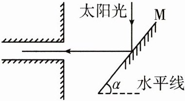 5. 为了把太阳光反射到一座洞口朝向正东方向的水平涵洞中去,小明设计安装了一块能自动调节方向的平面镜 $ M $,如图所示,中午时刻,太阳光垂直于水平地面照射,反射角为______,平面镜与水平面的夹角 $ \angle \alpha = $______;午后,随着太阳西斜,$ \angle \alpha $ 的角度应适当______(填“增大”或“减小”)。