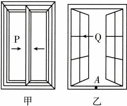 6. 下图是生活中常见的两种窗户,图甲窗户可在直线轨道上左右平移,图乙窗户可绕固定轴转动,若将图甲窗户左右平移打开,则人在 $ P $ 窗户中的像的大小将____(填“变大”“变小”或“不变”);在将图乙 $ Q $ 窗户转动打开的过程中,$ A $ 点的像的位置将____(填“改变”或“不变”)。