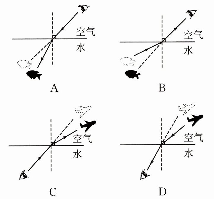 D 解析人站在岸上看水中的鱼,是看到由鱼反射的光从水中斜射入空气时,折射光进入人眼形成的虚像,由于折射角大于入射角,折射光线远离法线,所以看到像的位置比其实际位置要浅。人在水中看空中的飞机,是飞机反射的光从空气斜射入水中形成的虚像,因为折射角小于入射角,折射光线靠近法线,所以看到像的位置比其实际位置要高,故D 正确。