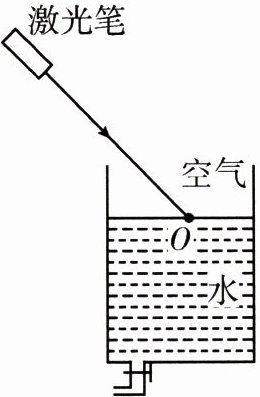 4. 如图所示,一支固定好的激光笔向盛有水的水槽发射一束激光照射到水面上的 $ O $ 点,光线经过折射在水槽底部形成一个光斑,此时折射角______(填“大于”“小于”或“等于”)入射角。打开水槽底部的水龙头缓慢放水,能观察到水槽底部光斑向______(填“左”或“右”)移动。