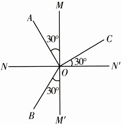 D 解析根据光的反射定律,反射角等于入射角,由∠BOM'=30°,∠AOM=30°可知,∠BON=60°,∠AON=60°,所以NN'为法线,MM'为界面,则BO是入射光线,OA 是反射光线,OC为折射光线,∠BON为入射角,等于60°,∠CON'为折射角,等于30°,MM'的右边是玻璃,故D正确。