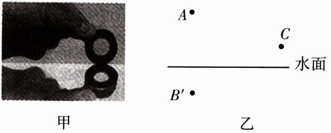7. 小强将两个大小相同的红、蓝环粘在一起形成“8”字。手拿红环将蓝环竖直放入水中,使蓝环刚好浸没,从水面上方 $ C $ 点可以观察到红环的“倒影”和蓝环的像并不完全重合,如图甲所示。请在图乙中作出: