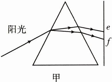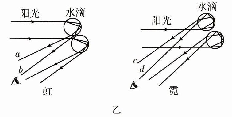 2. 如图甲所示,太阳光通过棱镜折射会被分解成各种颜色的光,这种现象叫作光的色散。自然界虹和霓的形成也与光的色散有关,虹和霓形成的简化模型如图乙所示,空中的水滴可简化为球形,太阳光射入后,在水滴内经过若干次折射和反射后射出。对比图中信息分析判断,下列说法正确的是( )。