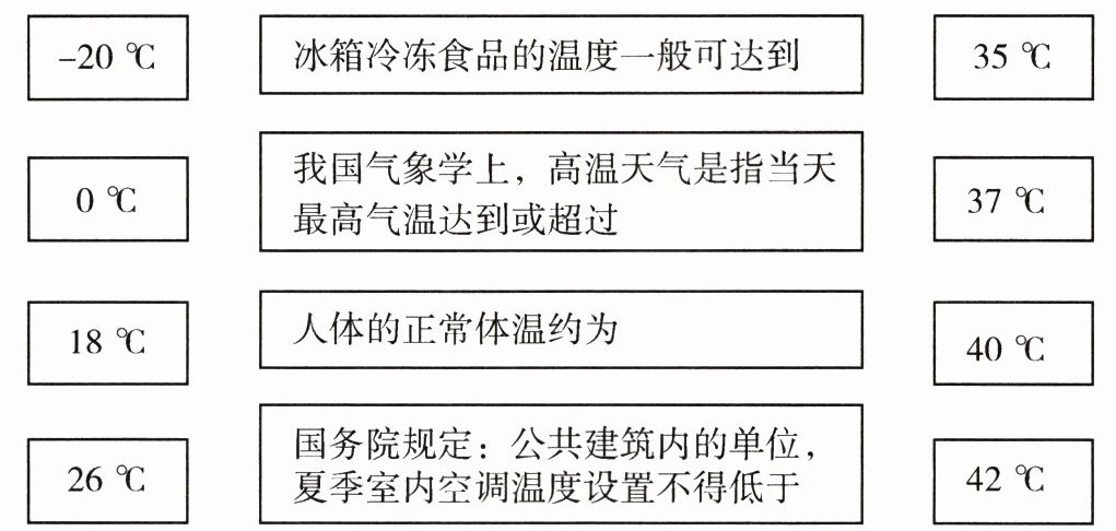 解析 查阅相关资料可知,冰箱冷冻食品的温度一般可达到—20℃;我国气象学上,高温天气是指当天最高气温达到或超过35℃;人体的正常体温约为37℃;国务院规定:公共建筑内的单位,夏季室内空调温度设置不得低于26℃。