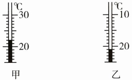 解析 温度计的刻度值由下往上增大,观察可知,图甲中30℃在上,20℃在下,温度为零上,且分度值为1℃,液柱的液面在20℃以上两格处,因此记为22℃;图乙中10℃在上,20℃在下,分析可知此时温度为零下,且液柱的液面在-20℃以下一格处,因此记为-21℃。