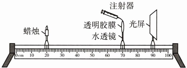 5. 为了研究眼睛的成像原理,小军自主制作了如图所示的实验装置。用水透镜模拟眼睛的晶状体,通过注水或抽水可改变水透镜的凸起程度。光屏和水透镜固定在光具座如图所示的位置。点燃蜡烛后,调节水透镜的凸起程度,直至光屏上成一个清晰倒立、______ 的实像。若将点燃的蜡烛向左移动一小段距离,要使光屏上重新得到清晰的像,应对水透镜______(填“注水”或“抽水”)。