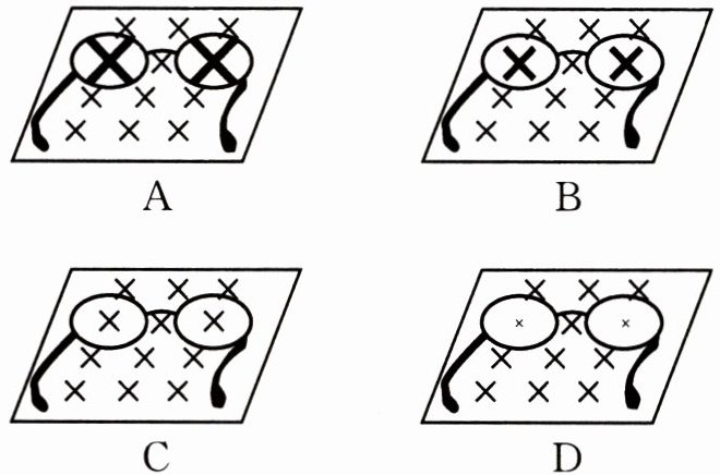 3. 小安的爷爷和爸爸都是老花眼,爷爷的老花眼更重一些;小安的妈妈眼睛既不近视,又不远视,有一个装饰用的平光镜(镜片既不是凸透镜也不是凹透镜);小安是近视眼。小安将四副眼镜放在报纸上,如图所示,由图可判断,爸爸的眼镜是( )。