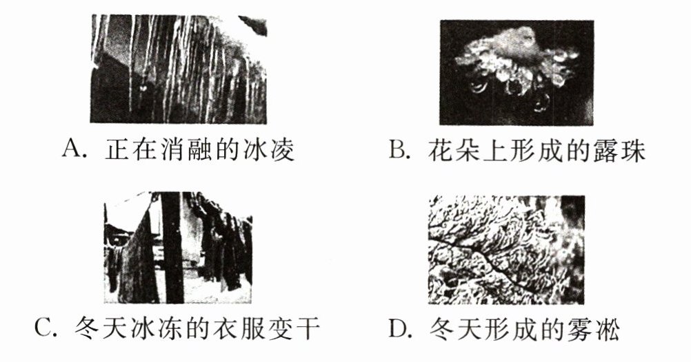 解析 碘颗粒吸收热量变成紫色的碘蒸气,由固态直接变成气态,是升华现象。冰凌消融,由固态变成液态,是熔化过程,故A错误。露珠是空气中的水蒸气遇冷液化形成的小水滴,故B错误。冰冻的衣服变干,冰直接变成水蒸气,是升华过程,故C正确。雾凇是空气中的水蒸气遇冷凝华形成的冰晶,故D错误。