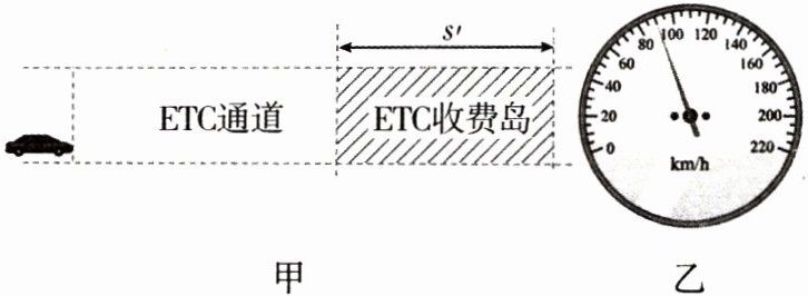 (1)25 min (2)36 m 解析(1)由题图乙,汽车到达收费站前速度为$v=90km/h$,行驶的路程$s=37.5km,$由$v=\frac {s}{t}$可知,汽车到达收费站前匀速行驶的时间$t=\frac {s}{v}=\frac {37.5km}{90km/h}=\frac {5}{12}h=25min$。(2)汽车以$v'=6m/s$的速度匀速通过 ETC收费岛,用时$t'=6s$,由$v=\frac {s}{t}$可知,ETC收费岛的长度$s'=v't'=6m/s×6s=36m$。