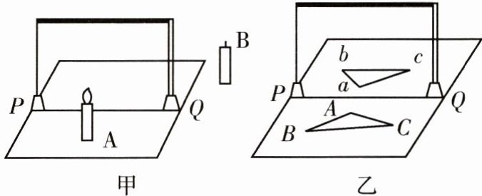 2. 在探究平面镜成像的特点实验中,如图甲所示,小明在水平桌面上铺一张白纸,纸上竖立一块玻璃板作为平面镜。沿着玻璃板在纸上画一条直线PQ,代表平面镜的位置。A和B是两支完全相同的蜡烛。