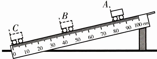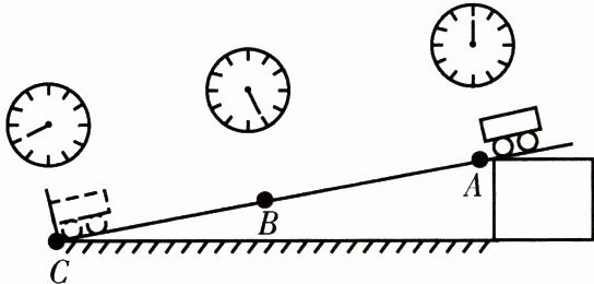 7. 如图所示,在测量小车运动的平均速度的实验中,让小车从斜面的 $ A $ 点由静止开始下滑并开始计时,分别测出小车到达 $ B $ 点和 $ C $ 点的时间,即可算出小车在各段的平均速度。