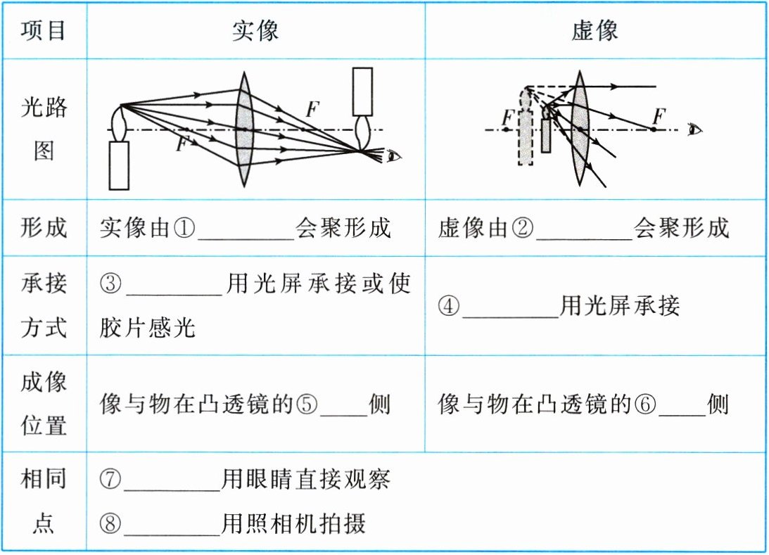①实际光线;②折射光线的反向延长线;③能;④不能;⑤两;⑥同;⑦都能;⑧都能