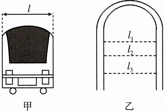 5. 如图甲所示,某列车车厢的宽度$l = 3.500m$。为判断该列车车厢能否通过一处老式隧道,技术人员分别测量了隧道内部三处的宽度,如图乙所示,测量结果为:$l_{1} = 3.600m$、$l_{2} = 3.480m$、$l_{3} = 3.540m$。技术人员使用的刻度尺分度值为______,该列车车厢______(填“能”或“不能”)通过该隧道。
