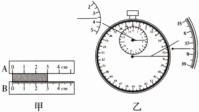 B 解析 由题图甲可知,A刻度尺的分度值是1 cm,故①说法错误。小红记录木块的长度是3.00 cm,则所用刻度尺的分度值为1 mm,利用了B刻度尺进行测量,故②说法正确。由题图乙可知,秒表小盘的分度值是0.5 min,指针在3 min和4 min之间,超过中线;大盘的分度值是0.1 s,而大盘指针指在37.5 s,因此秒表读数为3 min 37.5 s,即217.5 s,故③说法错误,④说法正确。B正确。