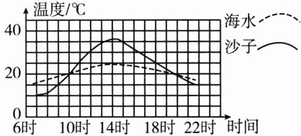 5. 某同学在海边玩耍,感觉沙滩上的沙子很热,海水却比较凉爽。某天,他从6时到22时对沙子和海水的温度进行了测量,绘成的温度随时间变化的图像如图所示。由图像我们可以看出,海水在一天中的温差比沙子小,这是因为海水的______比沙子的大。