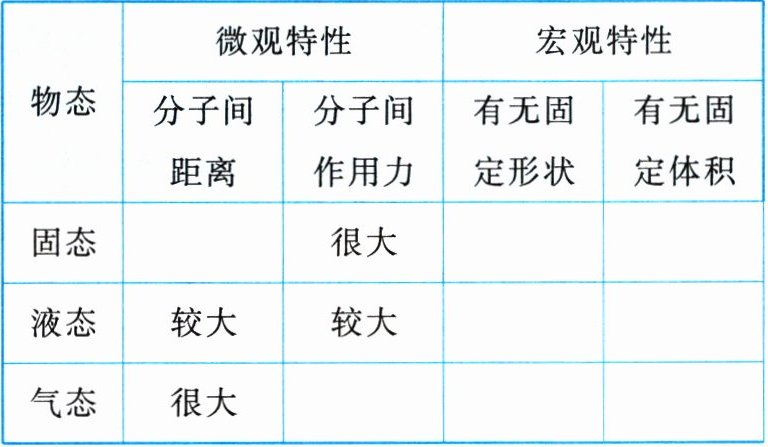 3. 下表归纳了物质固、液、气三态的微观特性和宏观特性,请完成这个表格。