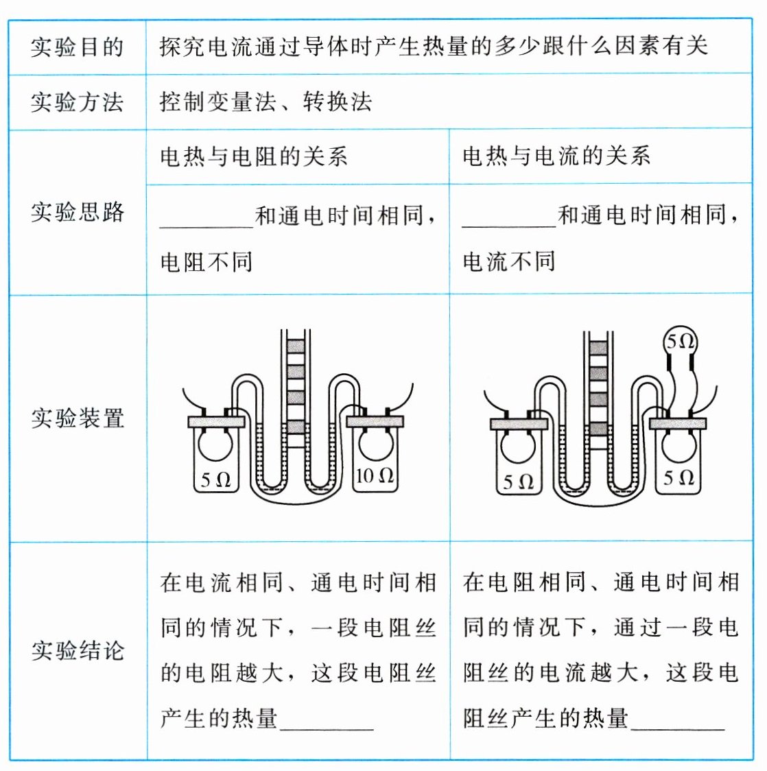 |实验思路|______和通电时间相同,电阻不同|______和通电时间相同,电流不同|
