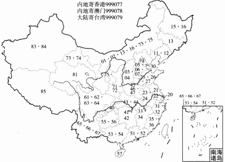 邮政编码是用数字或字母按照一定结构组成的代表邮区邮局和投递区域的代号。是邮政自动化分拣的前提和必要条件。我国邮政编码的前两位数字代表省级行政区。读邮政编码前两位数字代表的省级行政区分布图,完成1~4题。