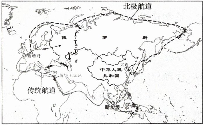 5. 北极航道的航行时间比传统航道短,原因是( )