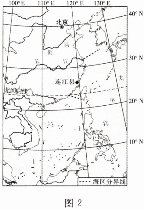 2023年5月9日,福州第11个深远海养殖平台“乾动2号”落户连江定海湾,设计年产优质大黄鱼200吨。图1为“乾动2号”景观图,图2为连江县位置示意图。据此完成1~3题。