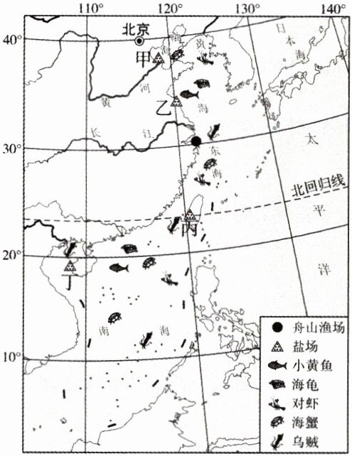 (1)海盐是海洋对人类的馈赠,主要是在盐田通过日晒获得。我国沿海各省级行政区都有海盐生产,其中位于渤海西岸的是______(填“甲”或“乙”)盐场,丙盐场是位于我国最大的岛屿——______上的______盐场;相较于丙盐场,甲盐场雨季更______(填“长”或“短”),更有利于晒制海盐。