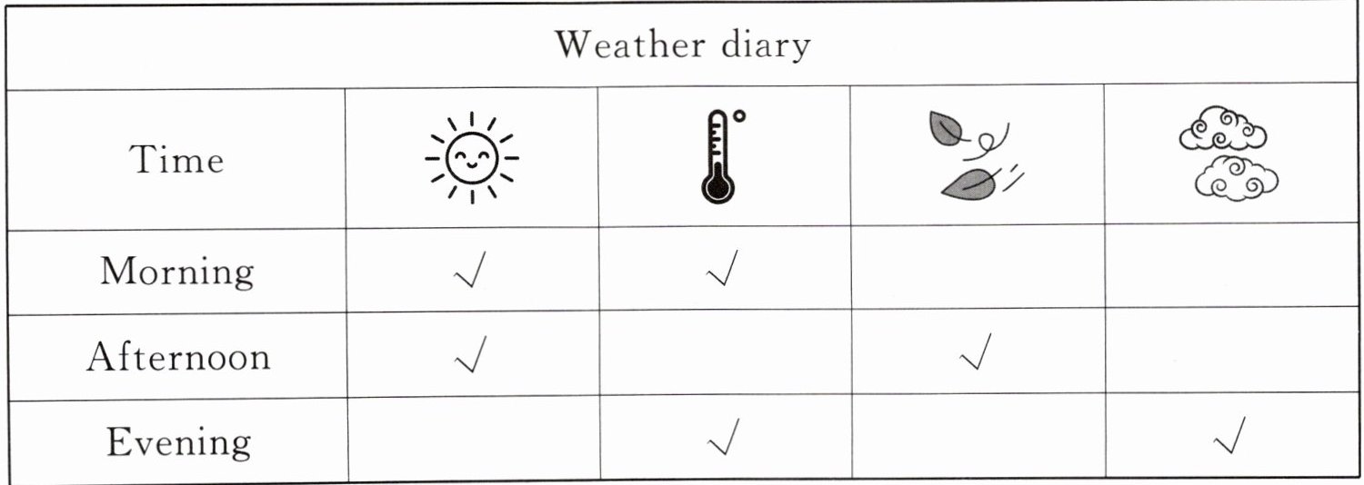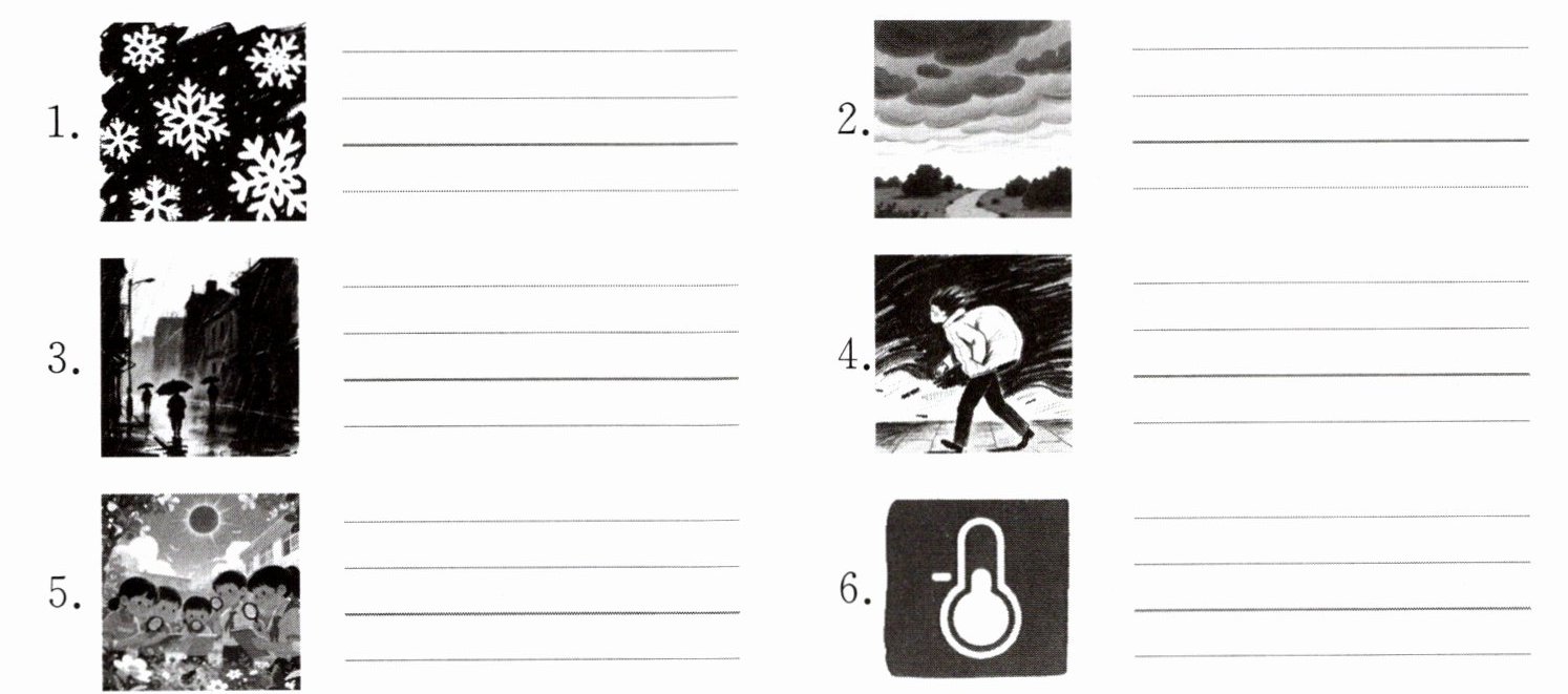 1. snowy 2. cloudy 3. rainy 4. windy 5. sunny 6. cold