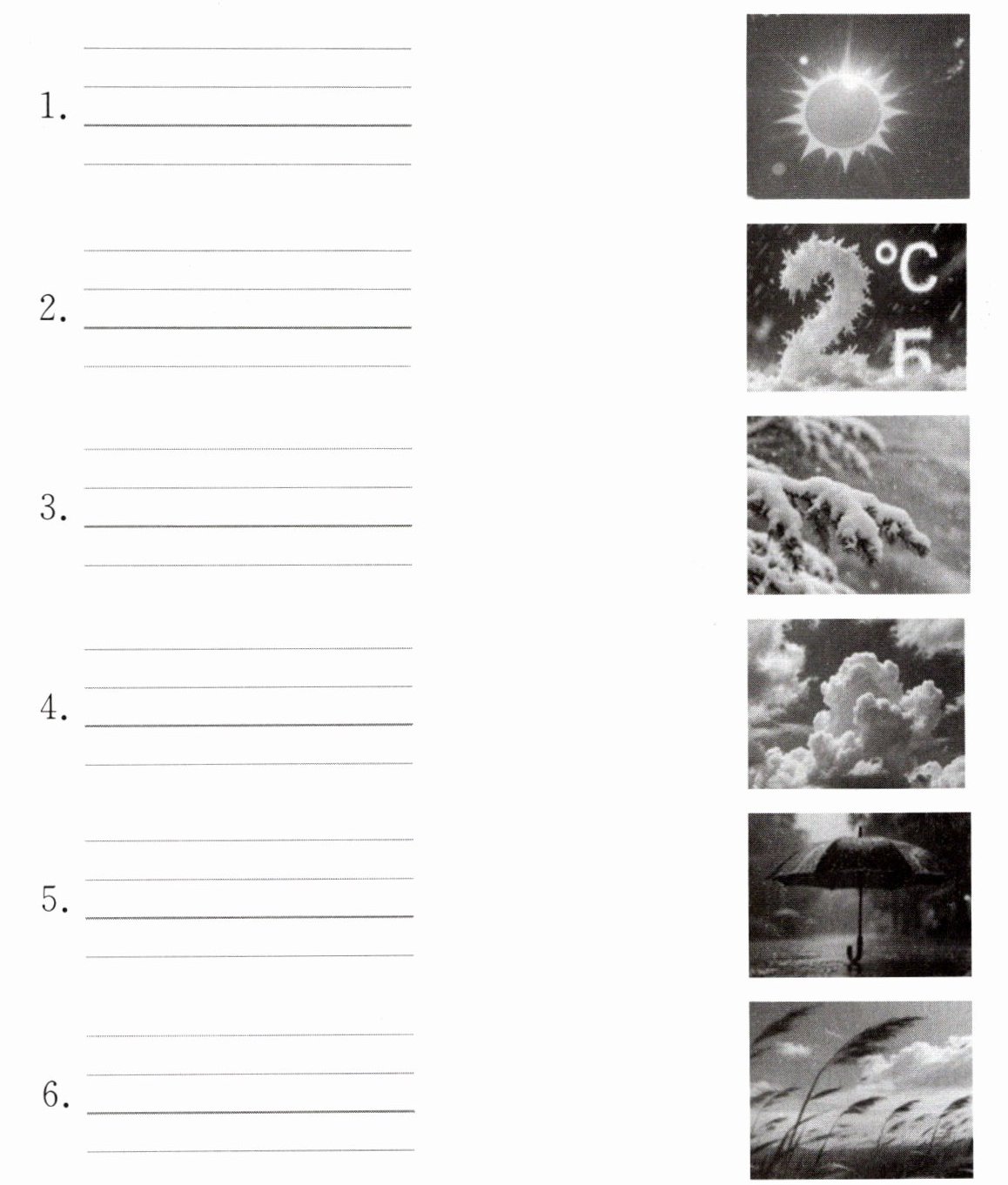 1. sunny 2. cold 3. snowy 4. cloudy 5. rainy 6. windy