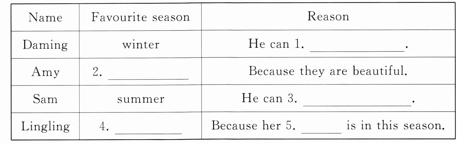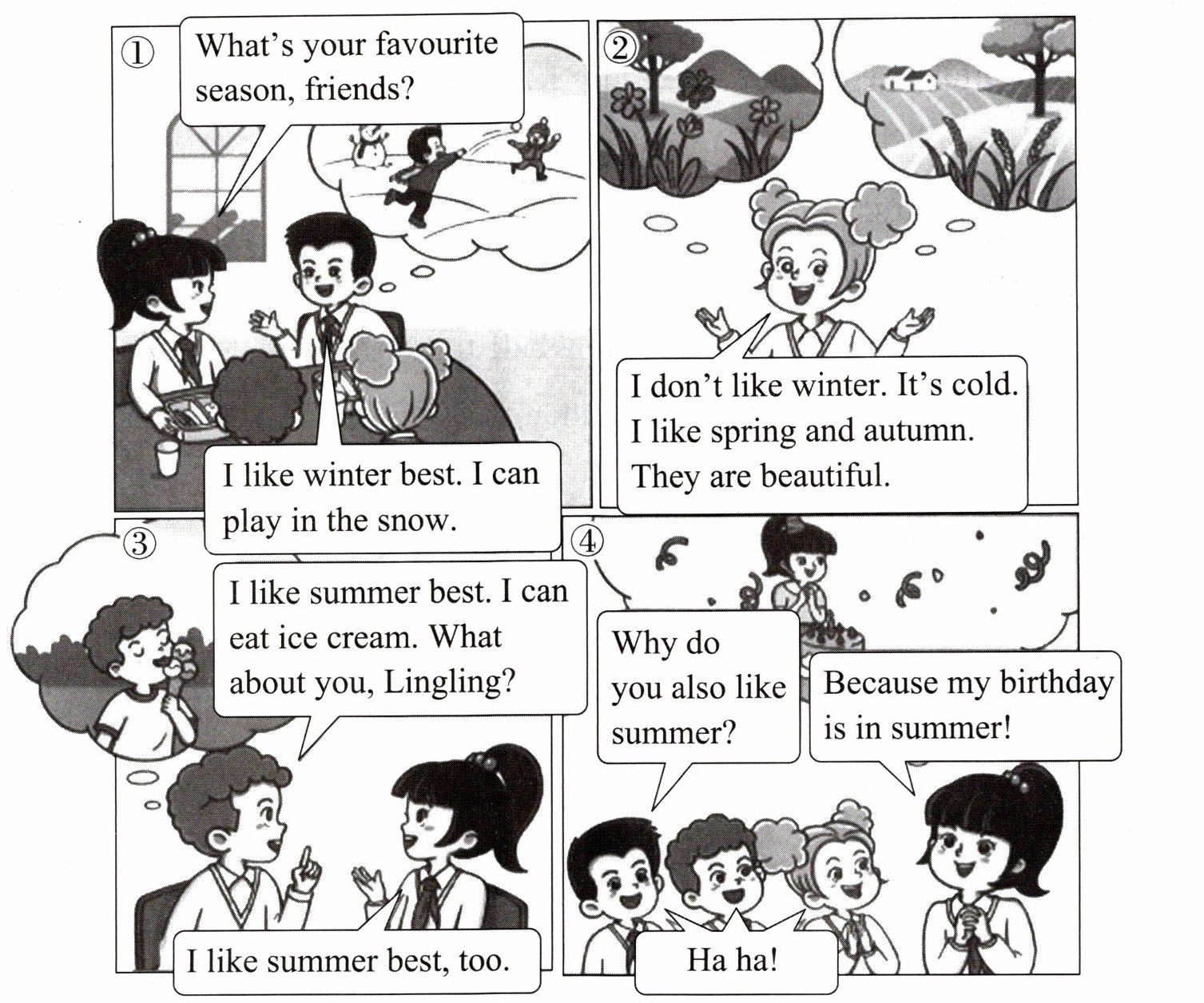 1. play in the snow 2. spring and autumn 3. eat ice cream 4. summer 5. birthday