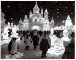 In Harbin,China,winter is very cold with heavy snowstorms. People make ice lanterns (冰灯).