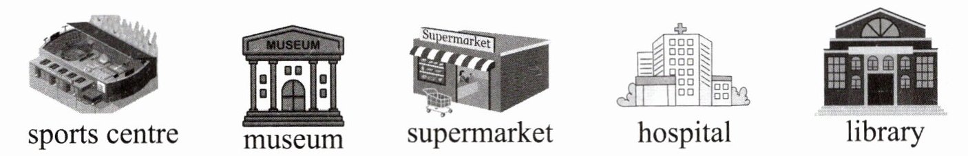 1. library 2. supermarket 3. museum 4. cinema 5. hospital 6. sports centre