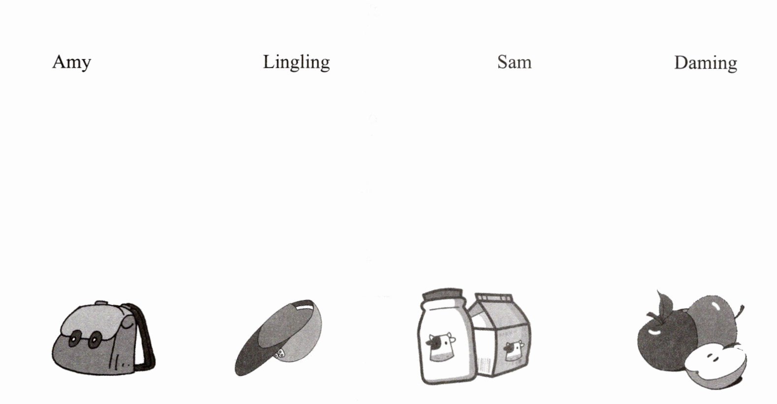 Amy—milk; Lingling—apples; Sam—caps; Daming—bags