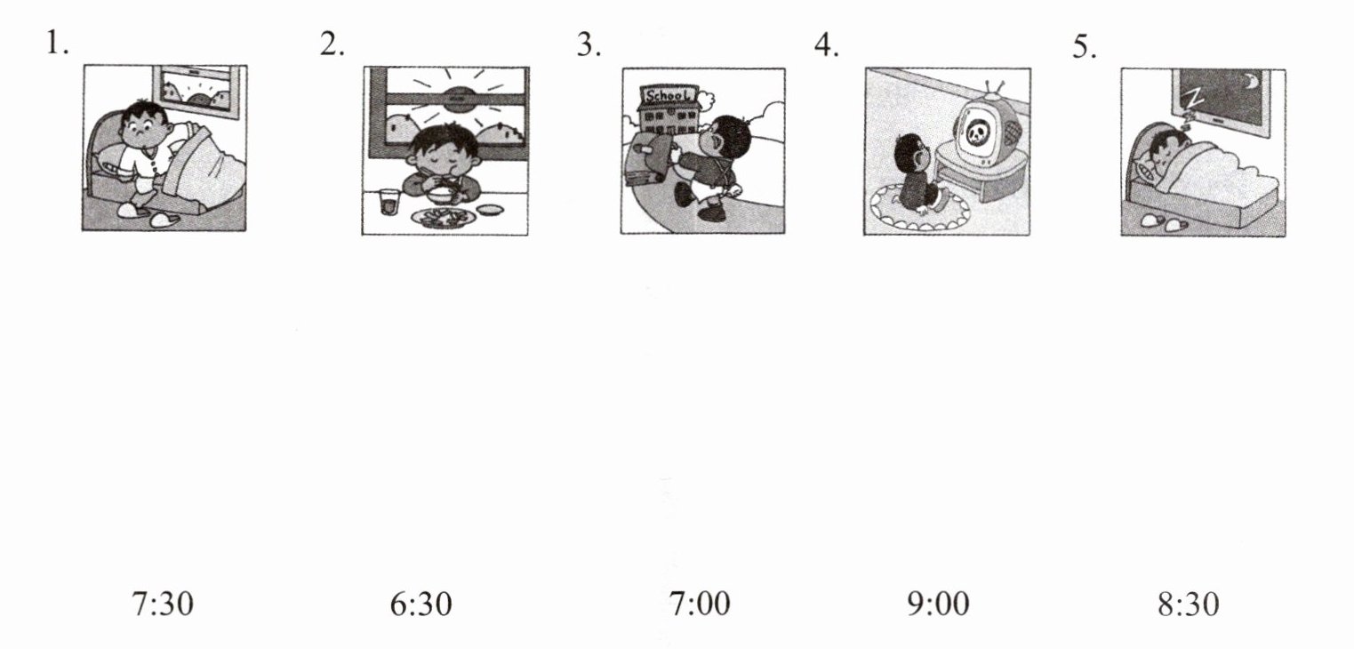 一、Listen and match. 听录音,将图片与时间连线。