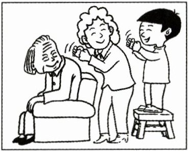 ① 画面中有一位老人坐在沙发上,一位中年妇女在为老人捶背,一个小男孩站在小凳子上为中年妇女捶背。
