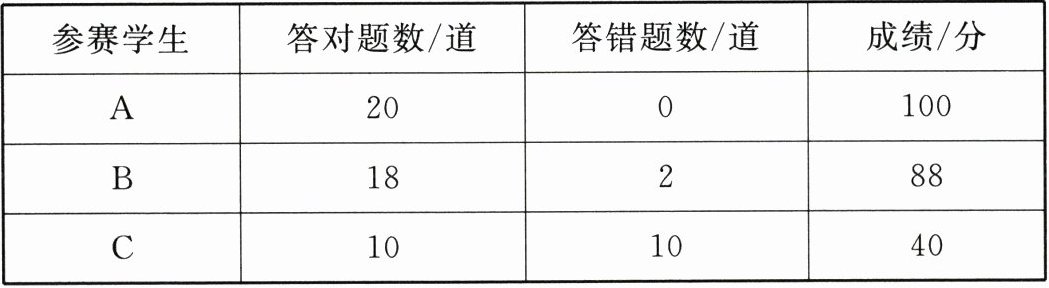 )|参赛学生|答对题数/道|答错题数/道|成绩/分|