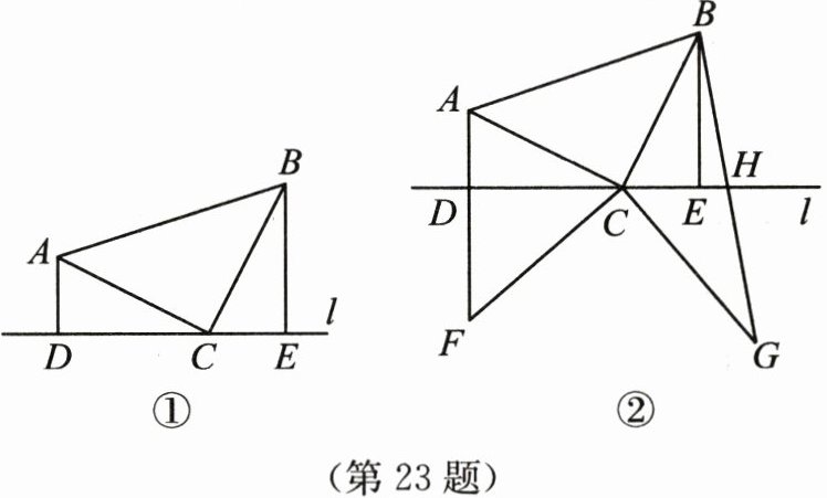 23. (本小题 10 分)如图①,在 Rt△ABC 中,∠ACB= 90°,AC= BC,直线 l 经过点 C,过点 A 作 AD⊥直线 l,垂足为 D,过点 B 作 BE⊥直线 l,垂足为 E.
