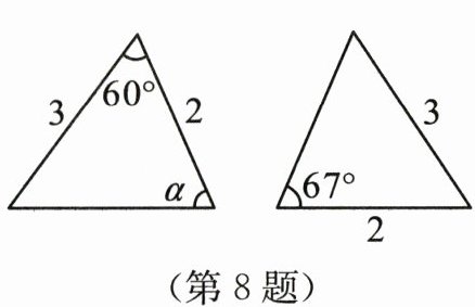 8. 如图,图中的两个三角形全等.根据图中所标数据,可知$\angle \alpha $的度数是______.