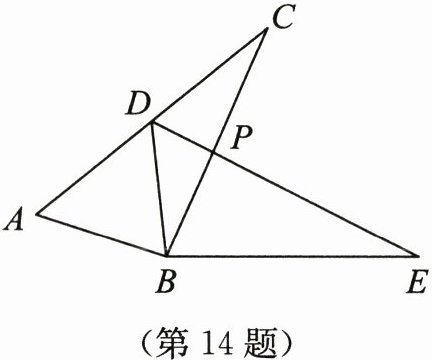14. 如图,$\triangle ABC\cong \triangle DBE$,点D在边AC上,BC与DE交于点P.若$\angle ABE= 162^{\circ }$,$\angle DBC= 30^{\circ }$,求$\angle CDE$的度数.