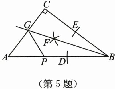 5. 如图,在Rt△ABC中,∠C= 90°,利用尺规分别在BC,BA上截取BE,BD,使BE= BD;分别以点D,E为圆心,大于$\frac{1}{2}DE$的长为半径作弧,两弧在∠CBA内交于点F;作射线BF交AC于点G.若AC= 3,AG= 2,P为AB上一动点,则 (