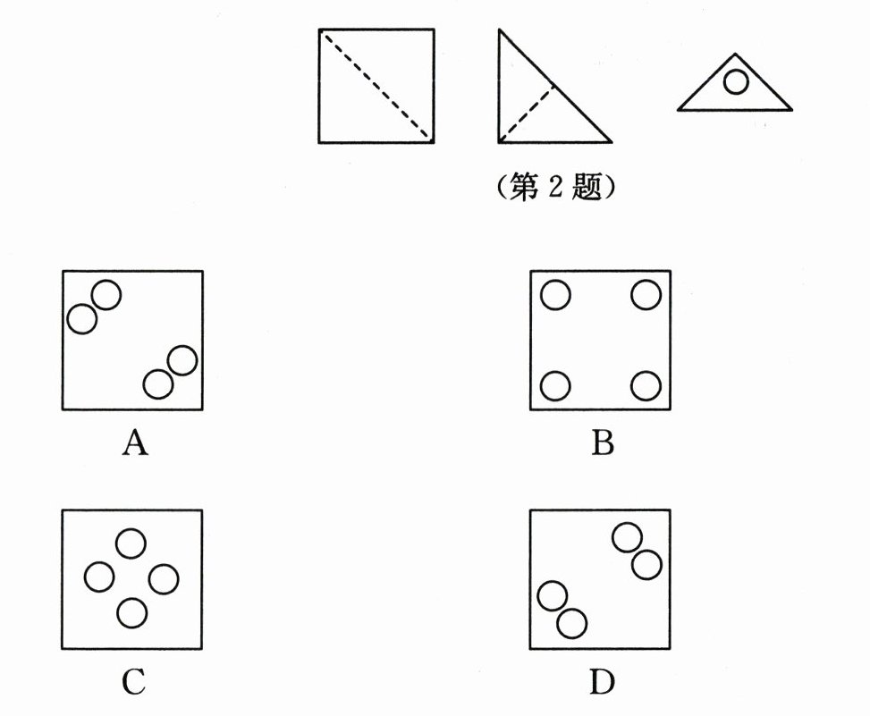2. 如图,把一张正方形纸片沿虚线对折两次后再挖去一个小圆孔,展开后的图形应为 (