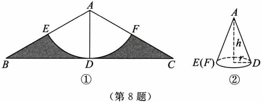 8. 如图①,在等腰三角形ABC中,∠BAC= 120°,AD是∠BAC的平分线,且AD= 6,以点A为圆心、AD的长为半径作$\overset{\frown}{EF}$,交AB于点E,交AC于点F.