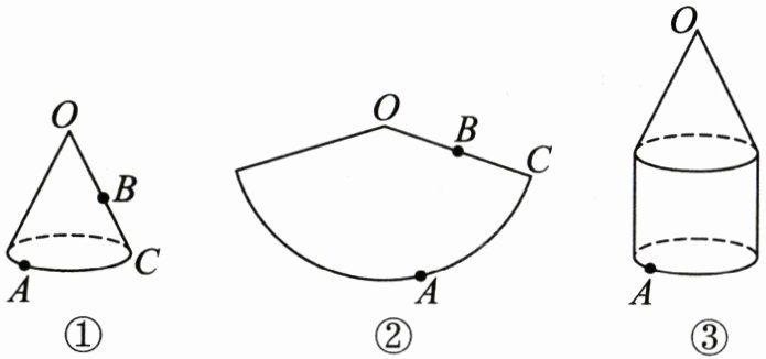 (1)如图①,圆锥的母线长为12 cm,B为母线OC的中点,点A在底面圆周上,$\overset{\frown}{AC}$的长为4π cm.在图②所示的圆锥的侧面展开图中作出蚂蚁从点A爬行到点B的最短路径,并标出它的长.(结果保留根号)