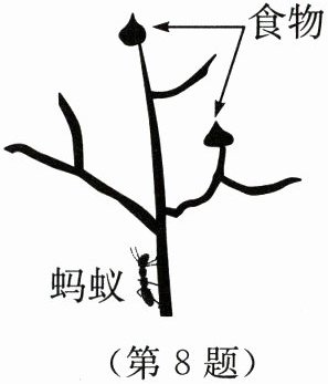 8. 如图,一只蚂蚁在树枝上寻觅食物,假定蚂蚁在每个岔路口都会随机选择其中一条路径,则它遇到食物的概率是