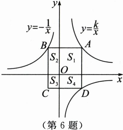 6. 如图,过反比例函数$y = \frac{k}{x}(x > 0)$的图象上的点 A,分别作 x 轴、y 轴的平行线交反比例函数$y= -\frac{1}{x}$的图象于 B,D 两点,以 AB,AD 为邻边的矩形 ABCD 被坐标轴分割成四个小矩形,面积分别记为$S_{1},S_{2},S_{3},S_{4}$.若$S_{2}+S_{3}+S_{4}= \frac{5}{2}$,则 k 的值为
