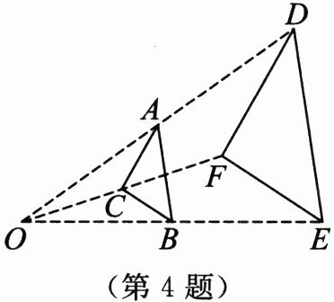 4. 如图,△ABC 与△DEF 位似,点 O 是它们的位似中心,$OE= 2OB$,则△ABC 与△DEF 的面积之比是