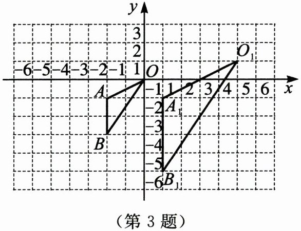 3. 如图,在平面直角坐标系中,每个小正方形的边长均为1个单位长度,△ABO 的顶点坐标分别为$ A(-2,-1),B(-2,-3),O(0,0),△A_1B_1O_1$的顶点坐标分别为$ A_1(1,-1),B_1(1,-5),O_1(5,1).△ABO $与$△A_1B_1O_1$是以点 P 为位似中心的位似图形,则点 P 的坐标为