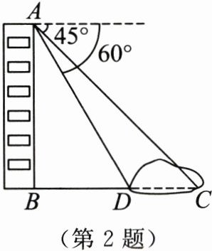 2. 如图,从楼顶 A 处看楼下荷塘 C 处的俯角为45°,看荷塘 D 处的俯角为60°,已知楼高 AB 为30 m,则荷塘的宽 CD 为
